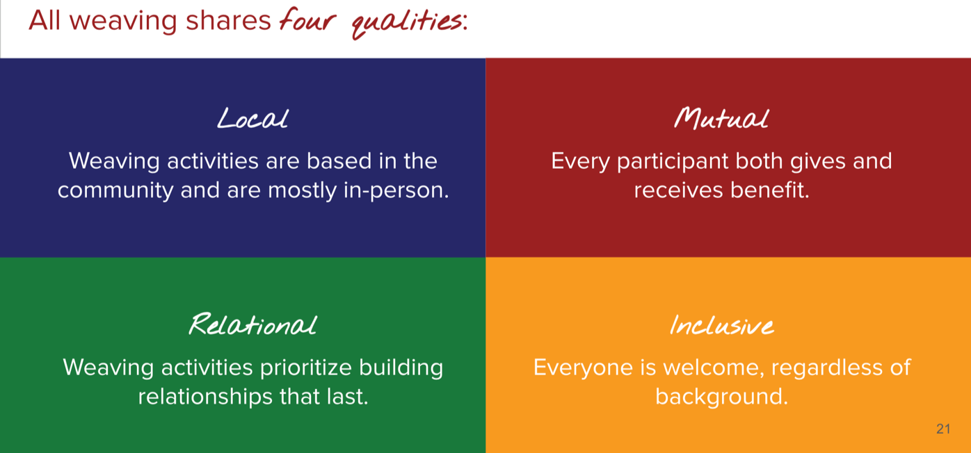 As a Community Host in partnership with Weave: The Social Fabric Project at the Aspen Institute, we will lead a four-year effort to find, support, and celebrate everyday neighbors who are building trust, nurturing belonging, and weaving the social fabric in our community.